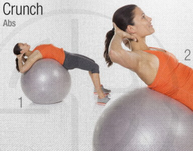 1. Lie with the center of your back on the ball, hands at the sides of your head and your feet flat, knees bent.