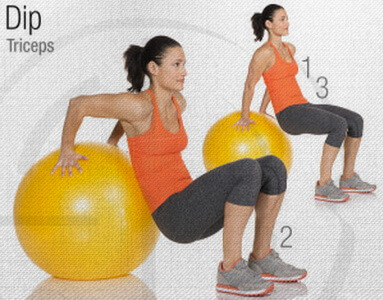 *Modification: Do tricep dips on a hard, stable surface and work your way toward using the ball.